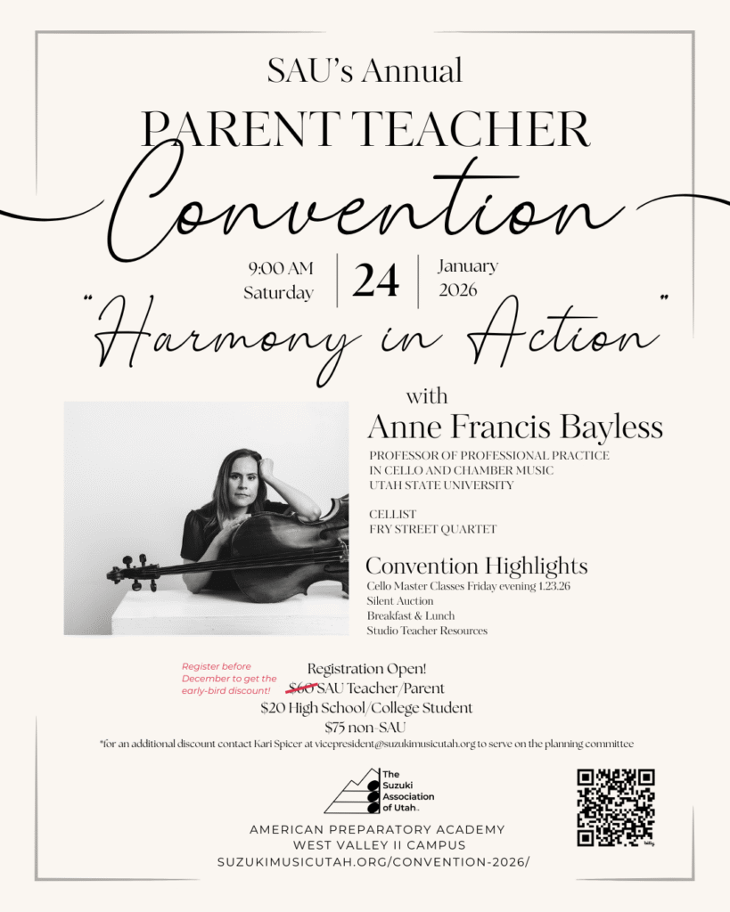 SAU Members pay a discounted rate! If you want to join today go here: https://suzukimusicutah.org/join-sau